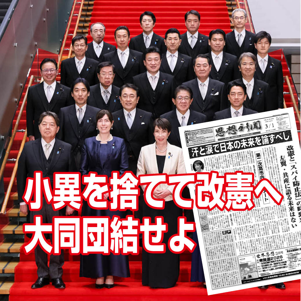 第2次高市早苗内閣が発足した。国民の負託に応え「強い日本」を創建することを期待したい。保守各党は小異を捨てて大同に就かねばならない。その大同とは憲法を改正し「戦後レジーム」に引導を渡すことだ。もとより現国会下で実現可能な施策については速やかに実現しなければならない。それこそが総選挙で示した民意だ。